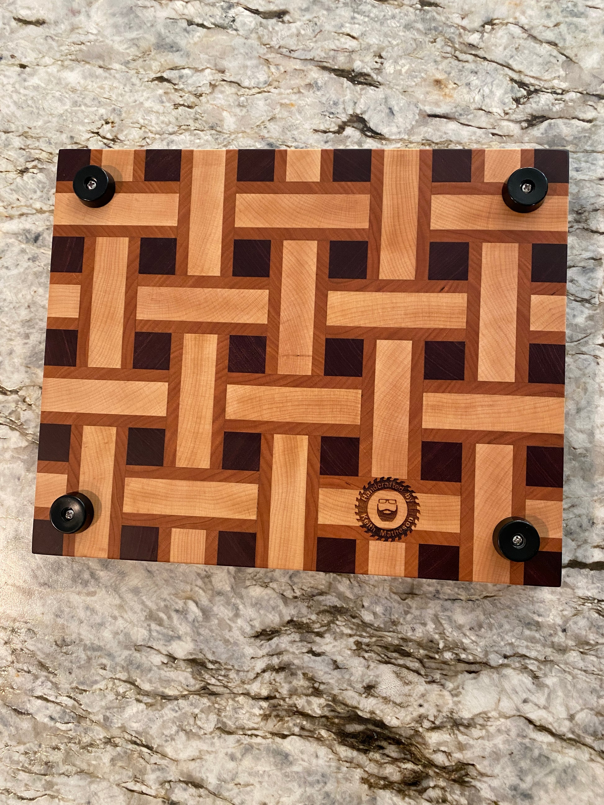 This beautiful basketweave end grain chopping block is made from Maple, Cherry, and Purple Heart. It comes with 1 inch rubber feet on the bottom. Use it for chopping, cutting, serving or charcuterie.
