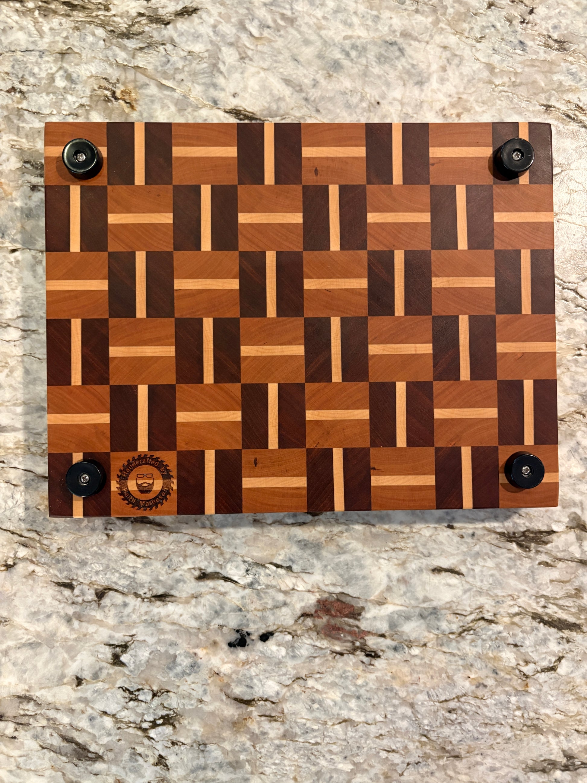 This beautiful basketweave end grain chopping block is made from Sapele, Cherry, and Maple. It comes with 1 inch rubber feet on the bottom. Use it for chopping, cutting, serving or charcuterie.