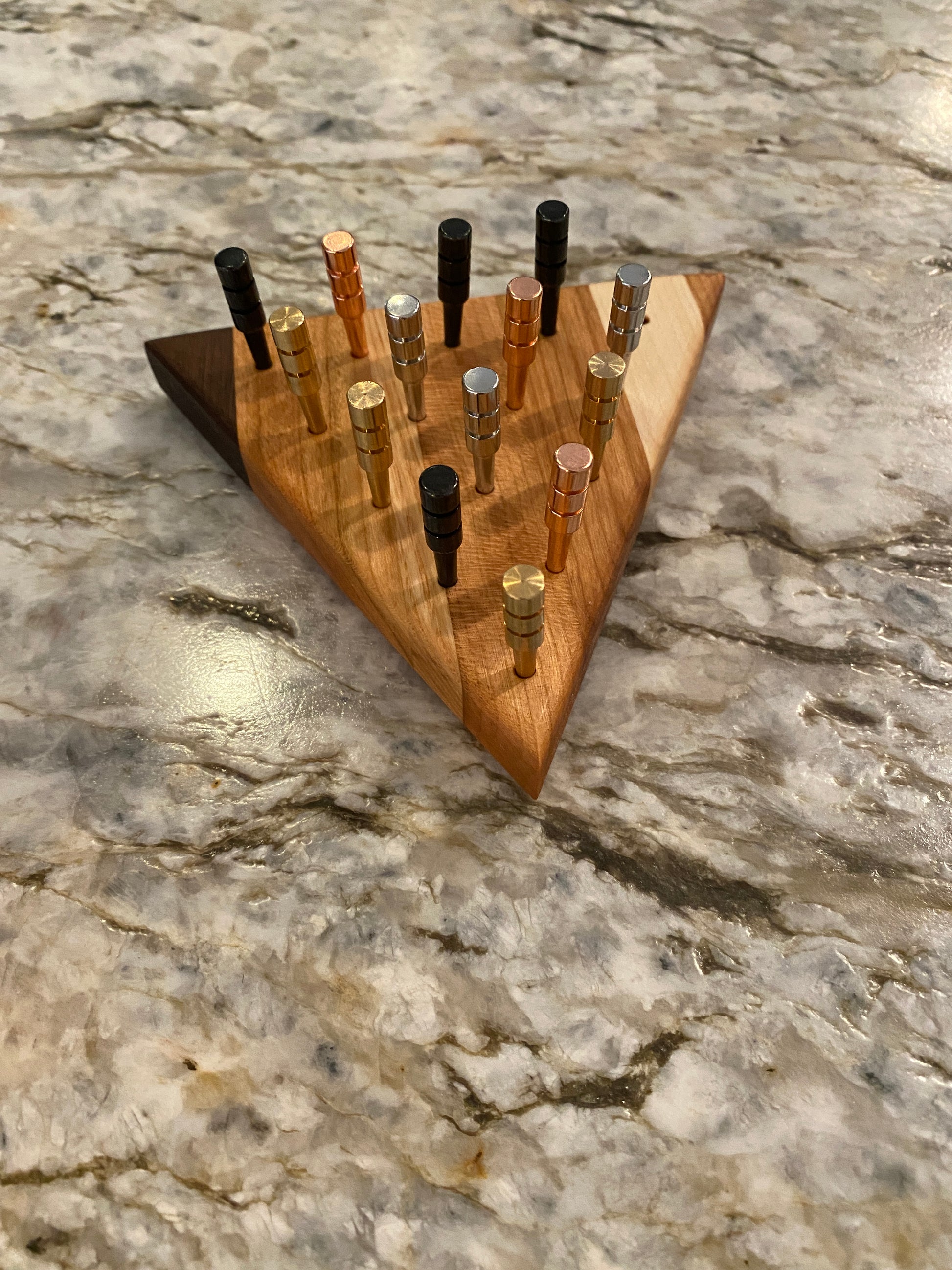 This handmade triangular peg game board is made from Cherry, Maple, Ash and Walnut. Board includes 14 metal pegs.