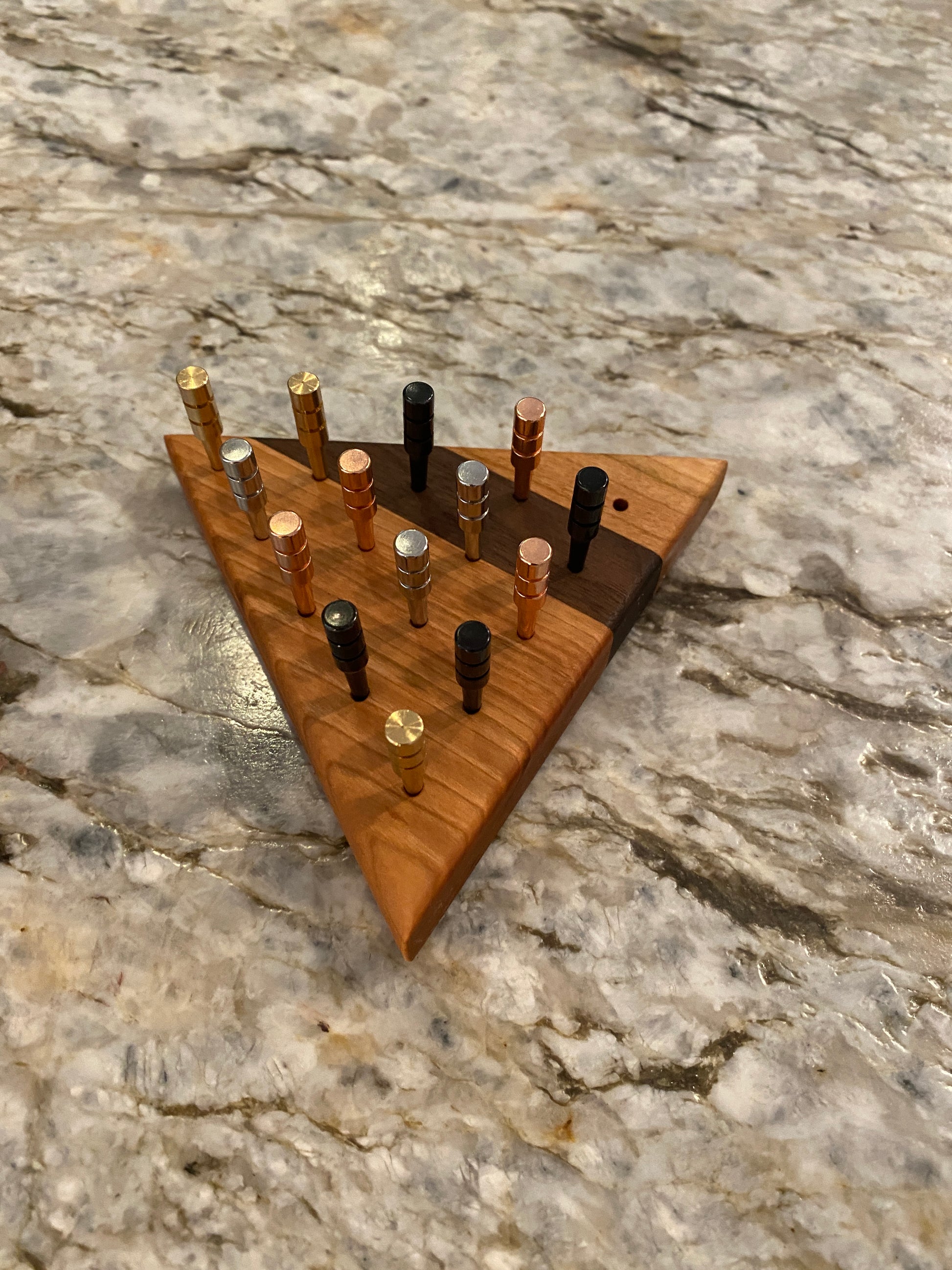 This handmade triangular peg game board is made from Cherry and Walnut. Board includes 14 metal pegs.